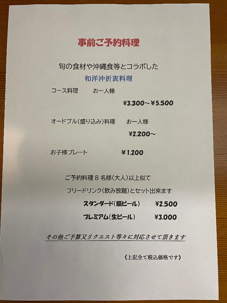 コース料理のご案内〜当店は既存のコース料理は無く季節の旬の食材を使って和洋折衷拘りの創作料理をお一人様一品づつのスタイルで提供させて頂いてます。お客様のご要望にお応えいたしますので気軽にご相談下さい料理¥3300〜 飲み放題¥2500(スタンダード) ¥3000(プレミアム)※8名様から飲み放題承ります